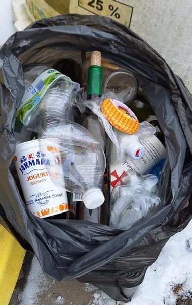 Všechny kontejnery na obrázku jsou prakticky prázdné. Zajímá Vás tedy, proč je vedle položený černý pytel? Prozkoumali jsme to za Vás – viz. přiložené foto. Při třídění pytle jsme se dotyčného snažili pochopit, ale ne, nechápeme to. Dovedete si představit, kdyby to takto dělal každý? Děkujeme velice všem, kteří se chovají slušně...
