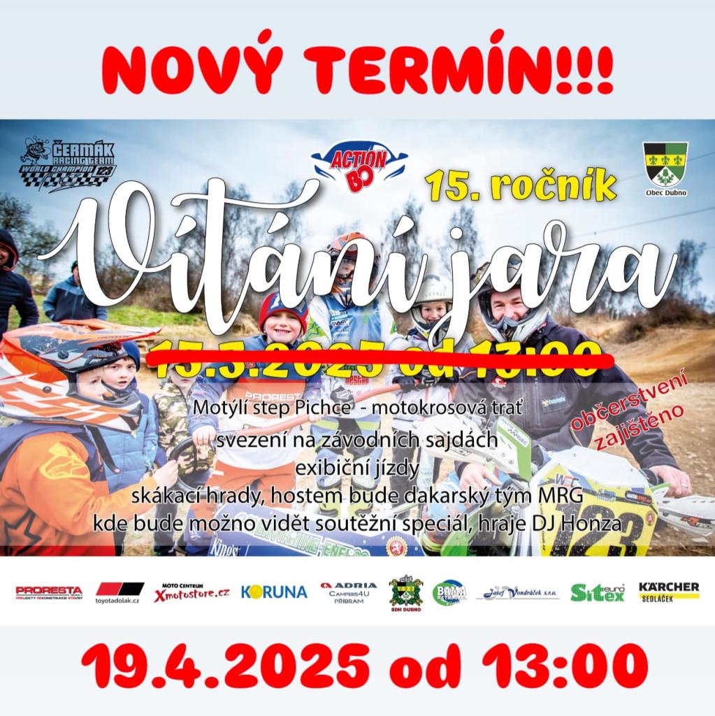 Čermák Racing team a Obec Dubno vás zvou na tradiční akci Vítání jara, která se uskuteční 19. dubna 2025 od 13:00 hodin na VKP Motýlí step Pichce. Čeká vás přehlídka motorek, čtyřkolek a sajdkár, svezení v závodních sajdách, skákací hrady pro děti a občerstvení. Hostem bude dakarský tým MRG se soutěžním speciálem. Hraje DJ Honza.